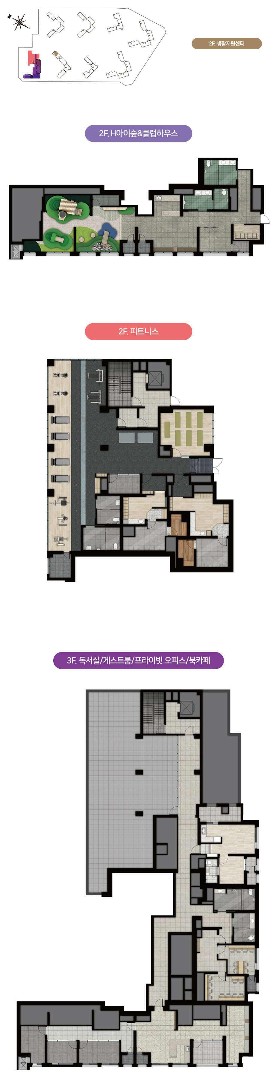 ※ 커뮤니티 공간내 운동기구, 옷장(락카), 독서실 책상은 기본 제공되며, H아이숲, 클럽하우스, 독서실, 게스트룸, 프라이빗 오피스, 북카페, 피트니스 등의 시설관리 및 운영을 위한 가구, 비품, 스탠드, 각종 집기류 등은 제공되지 않습니다.